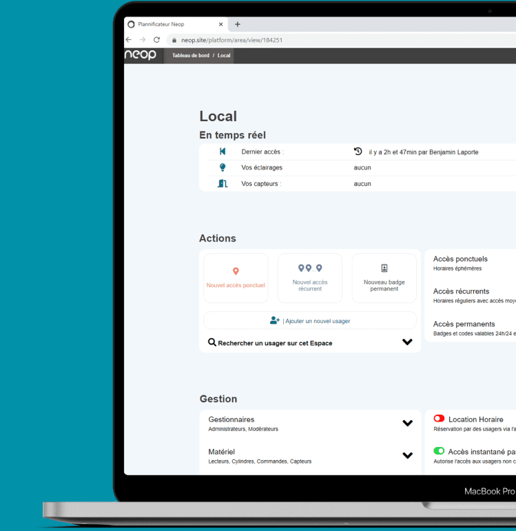 Tous les équipements de contrôle d'accès Neop sont connectés via une interface de supervision en ligne. Vous pouvez configurer, installer ou superviser l'ensemble des actions de vos équipements grâce aux outils de planification.