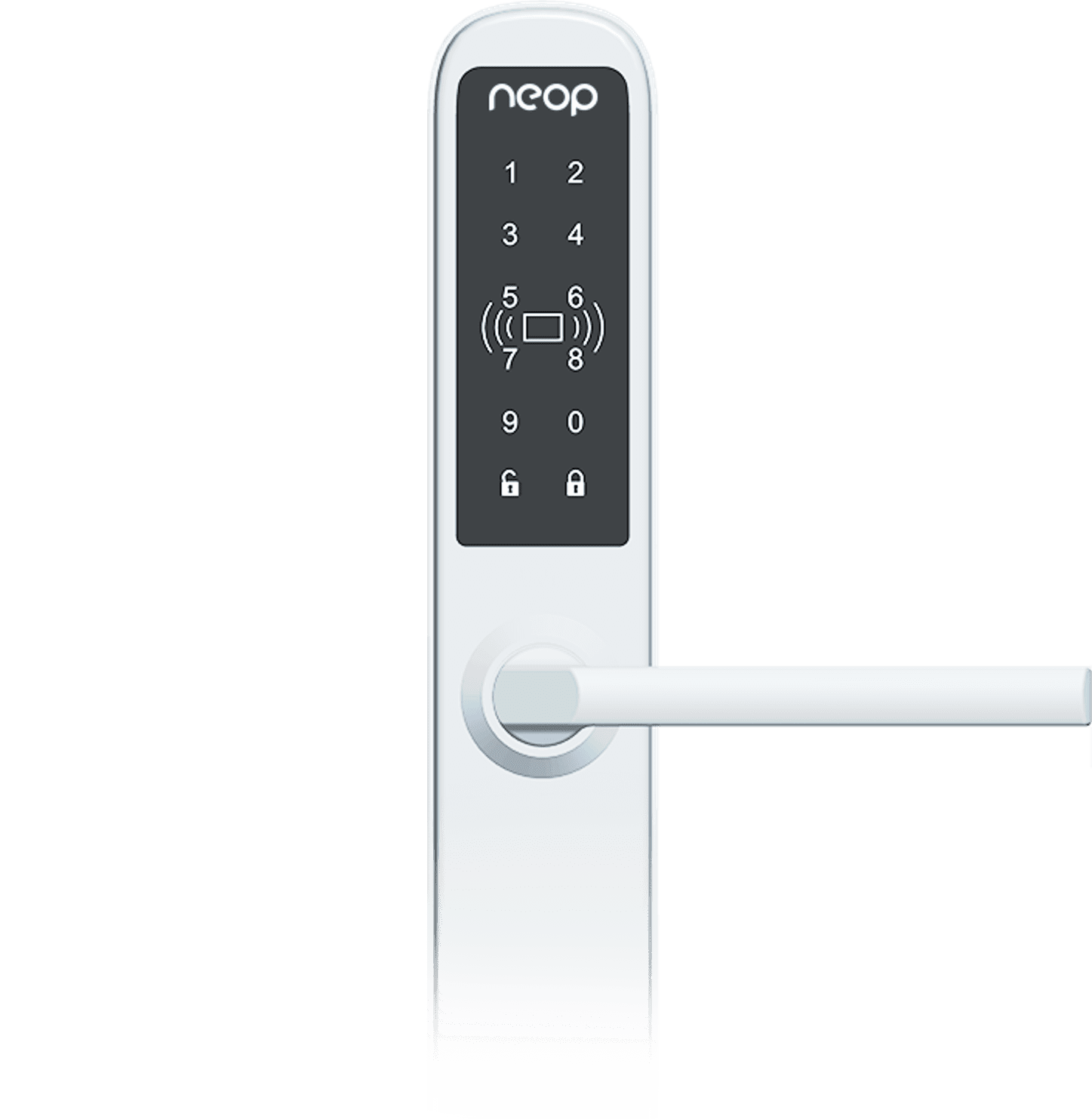 La serrure connectée Neop est autonome avec une durée de vie pouvant aller jusqu'à 5 ans. Elle est connectée via le réseau de supervision LoraWAN. C'est une béquille qui pilote le pêne demi-tour de la porte. Elle est étanche et convient aussi bien pour les installations intérieures qu'extérieures. Elle gère les codes et les badges, permanents et éphémères. Les alertes de vie de la pile sont envoyées à distance.